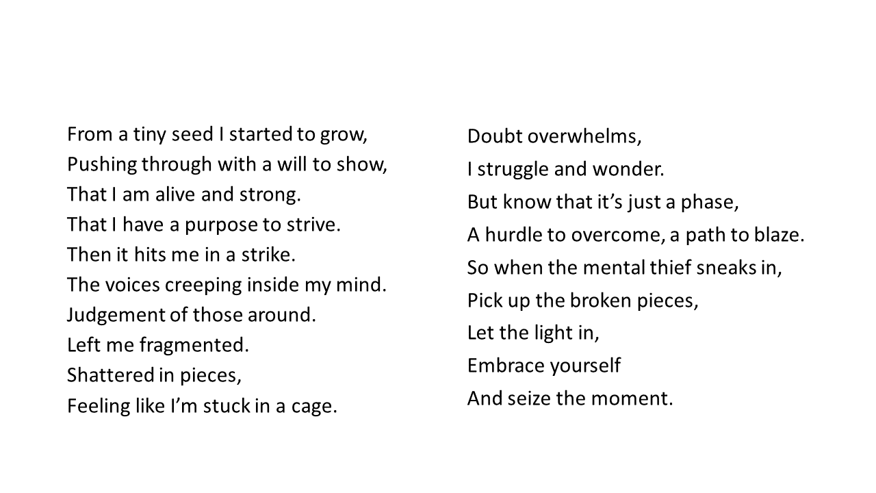 My project, “Pieces of Me”, is a self-reflection of my emotional journey from self-doubt to self-acceptance. There are always moments in life where we feel confident we can complete something, but then encounter an obstacle and feel self-doubt. Eventually, we accept the weaknesses in ourselves, overcome the obstacle and gain confidence again.